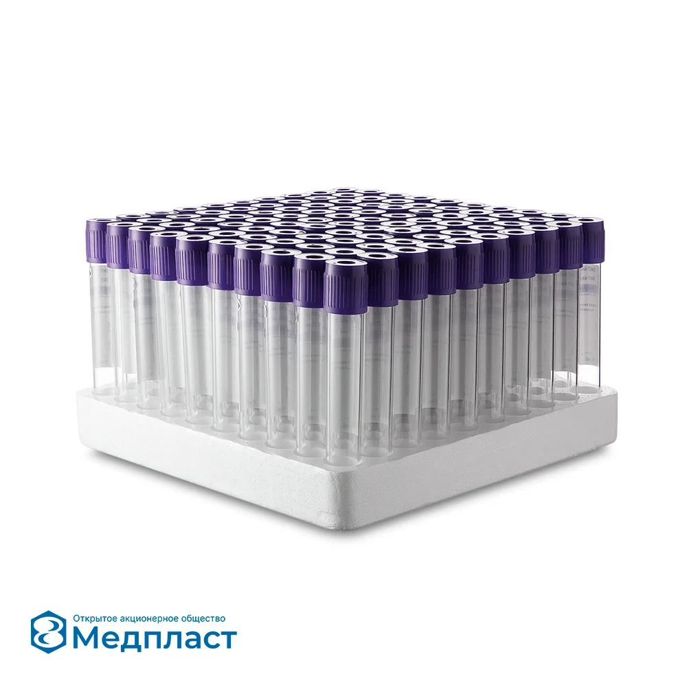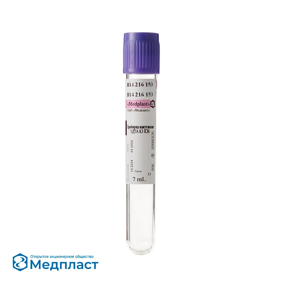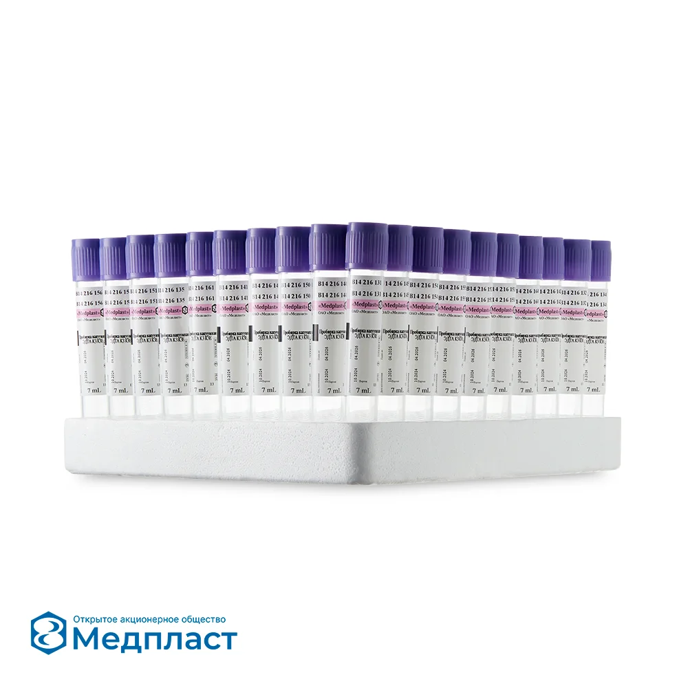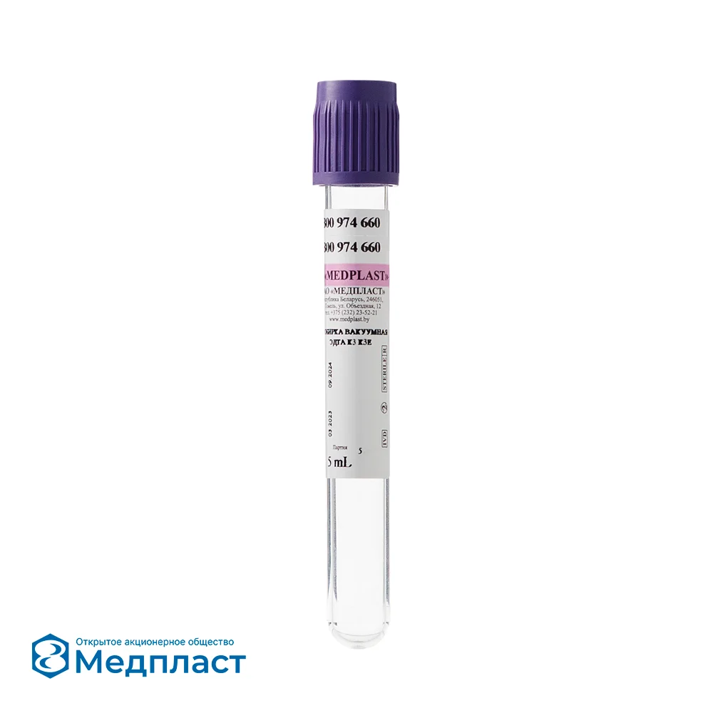Пробирки вакуумные Medplast с ЭДТА К3 используются в гематологии, ПЦР-диагностике, исследованиях групп крови. Наиболее широкое применение в клинической гематологии. ЭДТА связывает ионы кальция и блокирует каскад реакций свертывания крови. Концентрация и характеристики клеточных и внеклеточных компонентов остаются практически неизменными. K3 ЭДTA содержит три иона калия, связанных с ЭДTA и является антикоагулянтом.
